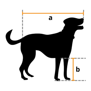 Largo: Mide desde la punta de la nariz hasta la base de la cola de tu mascota (Medida a) y añade la mitad de la Medida b (Mide desde el piso a la base del pecho de tu mascota).